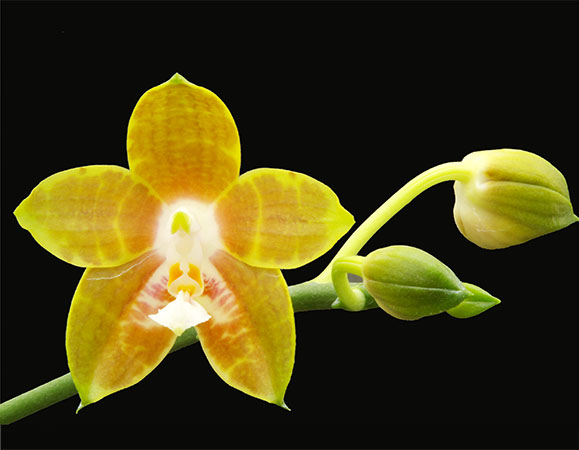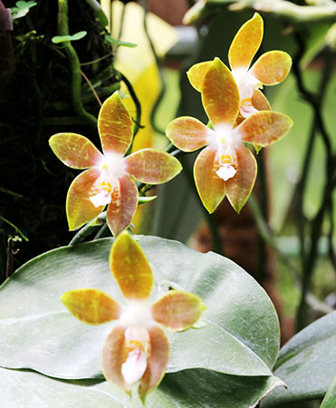 3. Phalaenopsis venosa f. semi-alba セパルおよびペタルは黄白色で僅かに赤褐色の斑点がある。中央弁の中心を走る突起(keel)の中央部での割れ目からはPhal. venosa、一方、中央弁先端から中央部外周に鋸歯状の凹凸が少ないことと、中央弁が楔型ではなく楕円形状であることはPhal. amboinensisの特徴をそれぞれ持っており、Phal. amboinensis f. albaとPhal. venosaとのハイブリッドの可能性も高い。